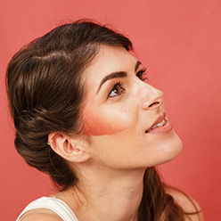 Para un efecto brillante: Después de matizar con polvos, aplique el colorete directamente en las mejillas con un movimiento suave. Luego mezcle el colorete con la esponja blender o el dedo.